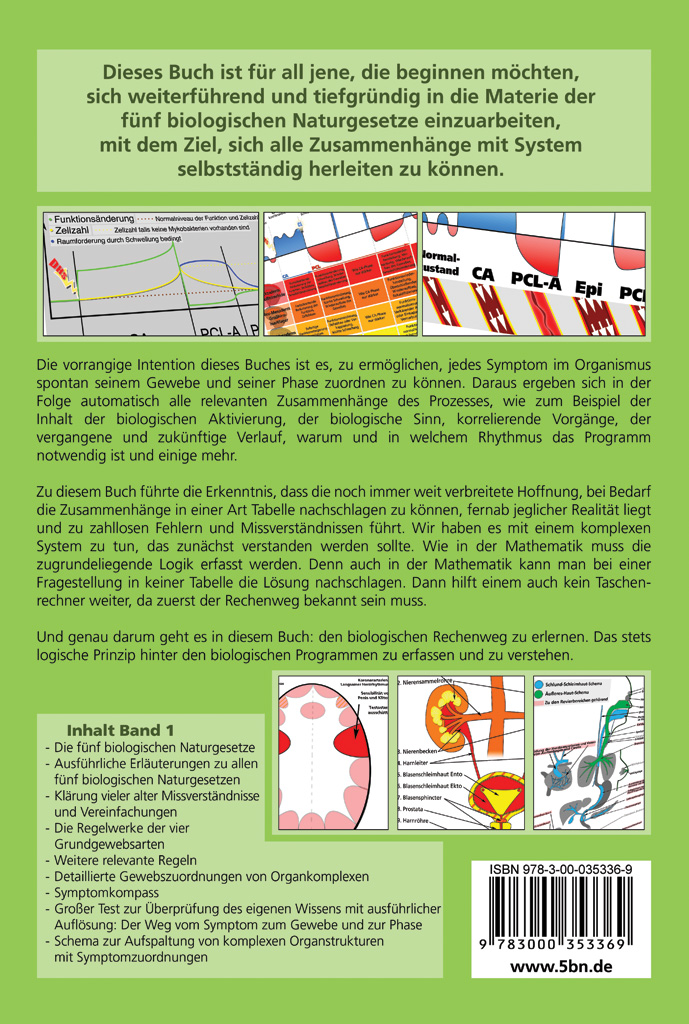 Das vorrangige Ziel von Band 1 ist es, zu ermöglichen, jedes Symptom im Organismus spontan seinem Gewebe und seiner Phase zuordnen zu können. Daraus ergeben sich in der Folge automatisch alle relevanten Zusammenhänge des Prozesses, wie zum Beispiel der Konfliktinhalt, der biologische Sinn, korrelierende Vorgänge, der vergangene und zukünftige Verlauf, warum und in welchem Rhythmus das Sonderprogramm notwendig ist und einige mehr.