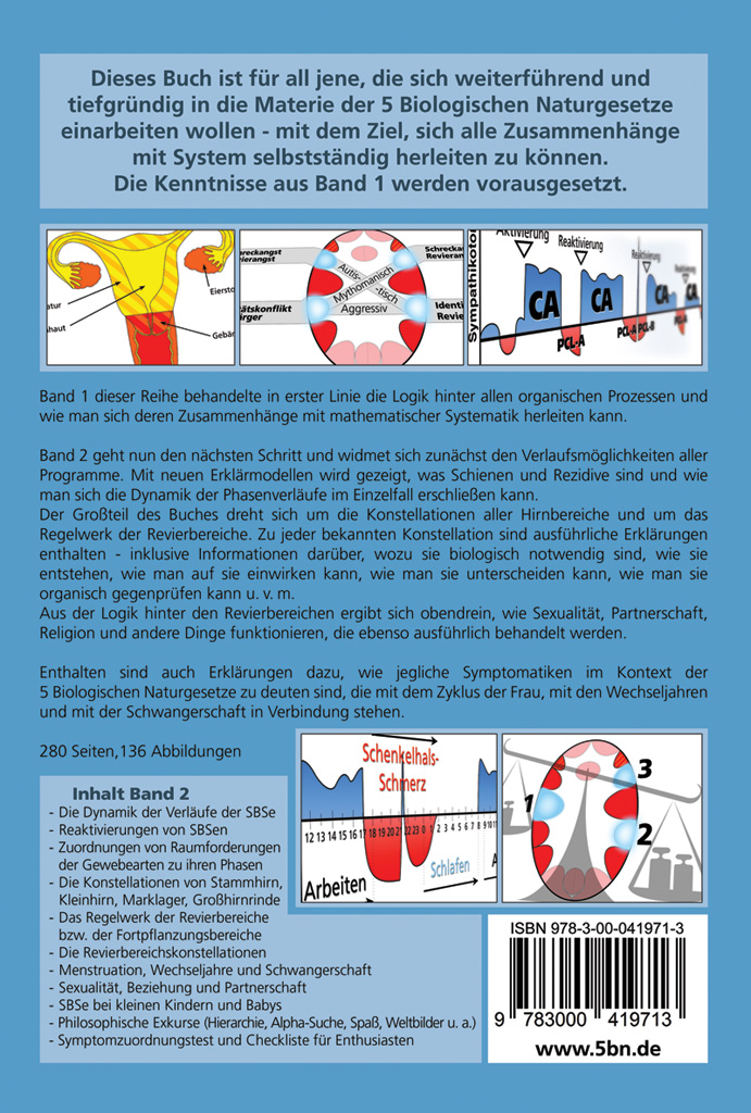 Band 2 geht den nächsten Schritt und widmet sich zunächst den Verlaufsmöglichkeiten aller Programme. Mit neuen Erklärmodellen wird gezeigt, was Schienen und Rezidive sind und wie man sich die Dynamik der Phasenverläufe im Einzelfall erschließen kann. Der Großteil des Buches dreht sich um die Konstellationen aller Hirnbereiche und um das Regelwerk der Revierbereiche. Zu jeder bekannten Konstellation sind ausführliche Erklärungen enthalten – inklusive Informationen darüber, wozu sie biologisch notwendig sind, wie sie entstehen, wie man auf sie einwirken kann, wie man sie unterscheiden kann, wie man sie organisch gegenprüfen kann u. v. m.